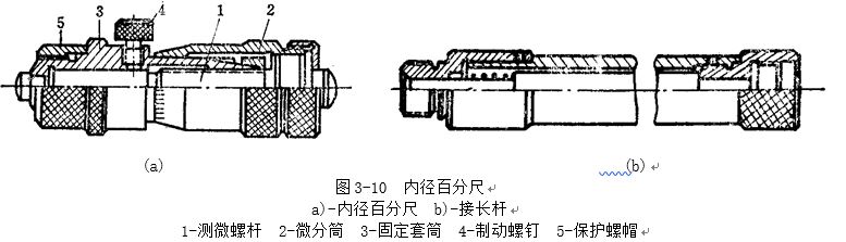 內(nèi)徑百分尺如圖3-10a所示,其讀數(shù)方法與外徑百分尺相同。內(nèi)徑百分尺主要用于測(cè)量大孔徑,為適應(yīng)不同孔徑尺寸的測(cè)量,可以接上接長(zhǎng)桿(如圖3-10b)。連接時(shí),只須將保護(hù)帽5旋去,將接長(zhǎng)桿的右端(具有內(nèi)螺紋)旋在百分尺的左端即可。接長(zhǎng)桿可以一個(gè)接一個(gè)地連接起來(lái),測(cè)量范圍最大可達(dá)到5000mm。內(nèi)徑百分尺與接長(zhǎng)桿是成套供應(yīng)的。目前,國(guó)產(chǎn)內(nèi)徑百分尺的測(cè)量范圍(mm)