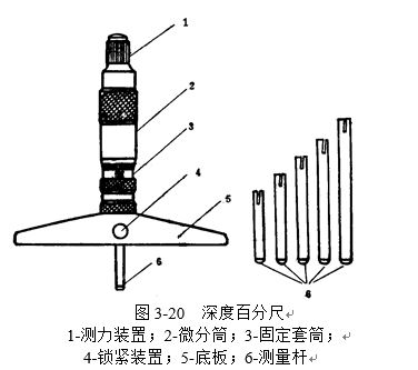 深度百分尺測量孔深時,應把基座5的測量面緊貼在被測孔的端面上。零件的這一端面應與孔的中心線垂直,且應當光潔平整,使深度百分尺的測量桿與被測孔的中心線平行,保證測量精度。此時,測量桿端面到基座端面的距離,就是孔的深度。