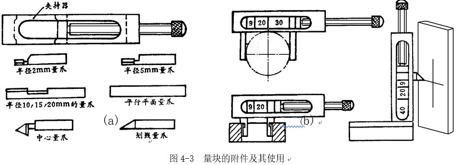 為了擴(kuò)大量塊的應(yīng)用范圍,便于各種測(cè)量工作,可采用成套的量塊附件。量塊附件中,主要的是不同長(zhǎng)度的夾持器和各種測(cè)量用的量腳,如圖4-3(a)所示。量塊組與量塊附件裝置后,可用作校準(zhǔn)量具尺寸(如內(nèi)徑百分尺的校準(zhǔn)),測(cè)量軸徑、孔徑、高度和劃線等工作,如圖4-3(b)所示。