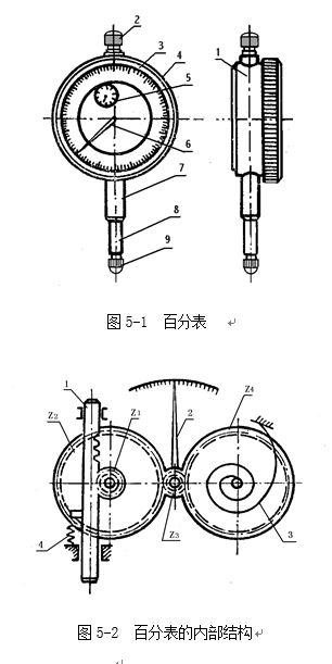 圖5-2是百分表內(nèi)部機構(gòu)的示意圖。帶有齒條的測量桿1的直線移動,通過齒輪傳動(Z1 、Z2 、 Z3),轉(zhuǎn)變?yōu)橹羔?的回轉(zhuǎn)運動。齒輪Z4和彈簧3使齒輪傳動的間隙始終在一個方向,起著穩(wěn)定指針位置的作用。彈簧4是控制百分表的測量壓力的。百分表內(nèi)的齒輪傳動機構(gòu),使測量桿直線移動1mm時,指針正好回轉(zhuǎn)一圈。