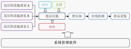 如圖所示,物料通過高壓輸液泵輸送到微反應(yīng)器中,在高壓密閉的微通道管路中,通過溫度控制,,使合成反應(yīng)能夠快速完成并極大提高收率,背壓閥能夠人為控制反應(yīng)器內(nèi)壓力,物料在出口處通過在線檢測器檢測合成結(jié)果,經(jīng)過檢測后的產(chǎn)品可通過樣品采集器按預(yù)設(shè)的收集條件收集到不同的容器中。整個(gè)反應(yīng)系統(tǒng)可通過管理軟件實(shí)現(xiàn)自動(dòng)控制,具有方法建立、模塊搭建、模塊參數(shù)設(shè)置,全反應(yīng)過程參數(shù)實(shí)時(shí)監(jiān)控,數(shù)據(jù)追溯,用戶管理及智能專家數(shù)據(jù)庫等功能,專用管理軟件可將整個(gè)反應(yīng)體系效率發(fā)揮到極致。