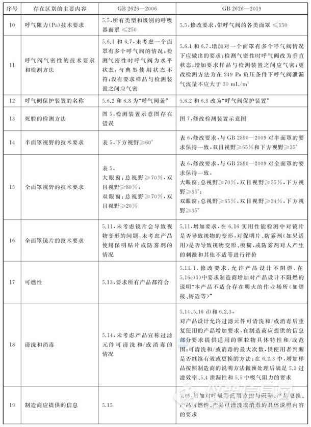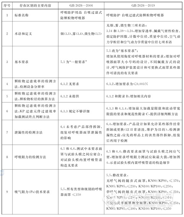 新標(biāo)準(zhǔn)在顆粒物過濾效率檢測方法(檢測設(shè)備分辨率、顆粒物粒徑的換算方法、KP過濾元件過濾效率加載測試終點(diǎn)判斷方法)、泄露性的檢測方法、呼吸阻力的檢測方法、呼吸阻力的技術(shù)要求、呼氣閥氣密性的技術(shù)要求和檢測方法、呼氣閥保護(hù)裝置的名稱、死腔的檢測方法、半面罩視野的技術(shù)要求、全面罩視野的技術(shù)要求、全面罩鏡片的技術(shù)要求、可燃性、清洗和消毒、制造商應(yīng)提供的信息、使用性能、頭帶測試方法等方面的要求都進(jìn)一步細(xì)化。