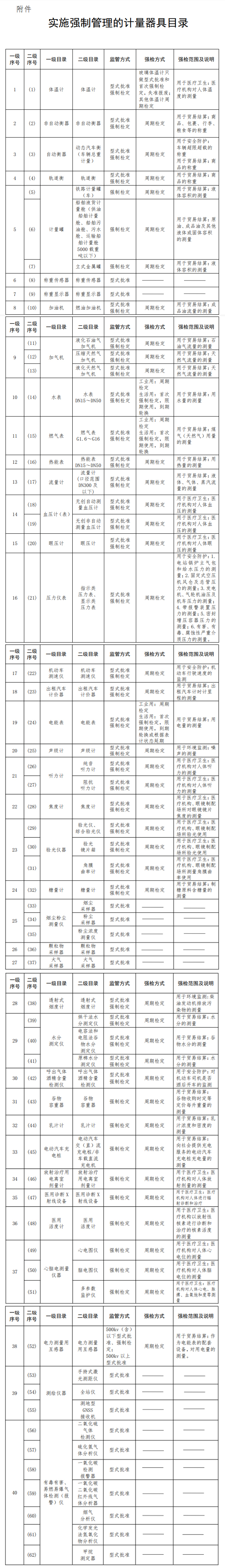 近日,為持續(xù)優(yōu)化營商環(huán)境,深入落實“放管服”改革舉措,市場監(jiān)管總局決定調整實施強制管理的計量器具目錄。現(xiàn)將調整后的《實施強制管理的計量器具目錄》(以下簡稱《目錄》)予以公布。