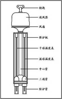 通風(fēng)干濕表的構(gòu)造如圖所示,主要由干濕球溫度表、通風(fēng)器、附件組成。通風(fēng)器采用機(jī)械裝置對干濕球溫度表的感應(yīng)球部進(jìn)行強(qiáng)制通風(fēng),保證感應(yīng)球部周圍的通風(fēng)速度穩(wěn)定在2.5m/s。干濕球溫度表的感應(yīng)球部裝在雙重金屬護(hù)管內(nèi),護(hù)管通過三通管和中央圓管與通風(fēng)器相通。儀器附件有濕潤紗布用的吸儲水橡皮囊、擋風(fēng)罩等。由于通風(fēng)干濕表表面鍍有反射性能很好的鎳或鉻,同時溫度表感應(yīng)球部又處于能防止熱傳導(dǎo)的雙重護(hù)管中,所以通風(fēng)干濕表可以在太陽光下進(jìn)行觀測,是野外觀測的常用儀器,但由于有金屬機(jī)械部分,因此不能在雨天使用,以免機(jī)械生銹。