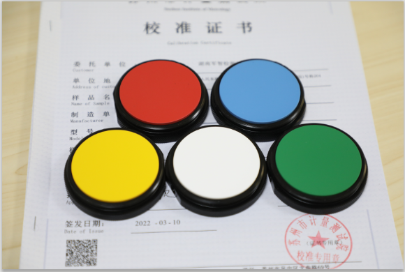 標(biāo)準(zhǔn)色板的材質(zhì)為陶瓷質(zhì)地,5塊/套,顏色為:白、紅、綠、藍(lán)、黃。