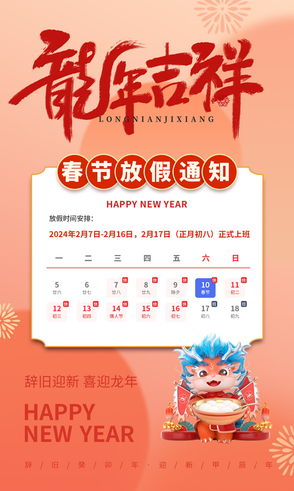 龍年新春佳節(jié)來臨之際,根據(jù)國家有關規(guī)定,現(xiàn)將2024年春節(jié)放假事項通知如下: