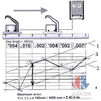 利用數顯式電子水平儀逐檔測量導軌的直線度,步距l(xiāng)有150mm, 180mm,200mm等。第一檔0-l,第二檔l-2l;并逐檔將讀數記錄下來。但取數后,進行計算或作坐標圖時,各類專業(yè)書上所采用的方法差別較大,常用的為作圖法和計算法。