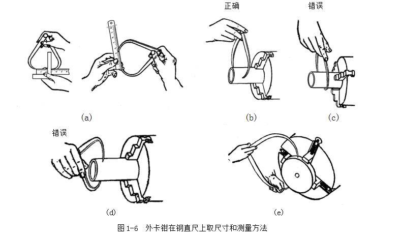 用巳在鋼直尺上取好尺寸的外卡鉗去測量外徑時,要使兩個測量面的聯(lián)線垂直零件的軸線,靠外卡鉗的自重滑過零件外圓時,我們手中的感覺應(yīng)該是外卡鉗與零件外圓正好是點(diǎn)接觸,此時外卡鉗兩個測量面之間的距離,就是被測零件的外徑。所以,用外卡鉗測量外徑,就是比較外卡鉗與零件外圓接觸的松緊程度,如圖1-6(b)以卡鉗的自重能剛好滑下為合適。如當(dāng)卡鉗滑過外圓時,我們手中沒有接觸感覺,就說明外卡鉗比零件外徑尺寸大,如靠外卡鉗的自重不能滑過零件外圓,就說明外卡鉗比零件外徑尺寸小。切不可將卡鉗歪斜地放上工件測量,這樣有誤差。圖1-6(c) 所示。由于卡鉗有彈性,把外卡鉗用力壓過外圓是錯誤的,更不能把卡鉗橫著卡上去,圖1-6(d) 所示。對于大尺寸的外卡鉗,靠它自重滑過零件外圓的測量壓力已經(jīng)太大了,此時應(yīng)托住卡鉗進(jìn)行測量,圖1-6(e)所示。