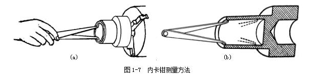 用內卡鉗測量內徑時,應使兩個鉗腳的測量面的聯線正好垂直相交于內孔的軸線,即鉗腳的兩個測量面應是內孔直徑的兩端點。因此,測量時應將下面的鉗腳的測量面停在孔壁上作為支點(圖1-7a),上面的鉗腳由孔口略往里面一些逐漸向外試探,并沿孔壁圓周方向擺動,當沿孔壁圓周方向能擺動的距離為最小時,則表示內卡鉗腳的兩個測量面已處于內孔直徑的兩端點了。再將卡鉗由外至里慢慢移動,可檢驗孔的圓度公差,圖1-7b 所示。
