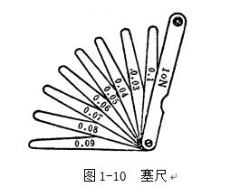 塞尺又稱厚薄規(guī)或間隙片。主要用來檢驗(yàn)機(jī)床特別緊固面和緊固面、活塞與氣缸、活塞環(huán)槽和活塞環(huán)、十字頭滑板和導(dǎo)板、進(jìn)排氣閥頂端和搖臂、齒輪嚙合間隙等兩個(gè)結(jié)合面之間的間隙大小。塞尺是由許多層厚薄不一的薄鋼片組成(圖1-10)按照塞尺的組別制成一把一把的塞尺,每把塞尺中的每片具有兩個(gè)平行的測量平面,且都有厚度標(biāo)記,以供組合使用。