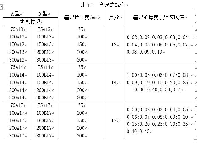 測量時(shí),根據(jù)結(jié)合面間隙的大小,用一片或數(shù)片重迭在一起塞進(jìn)間隙內(nèi)。例如用0.03mm的一片能插入間隙,而0.04mm的一片不能插入間隙,這說明間隙在0.03~0.04mm之間,所以塞尺也是一種界限量規(guī)。塞尺的規(guī)格見表1-1。
