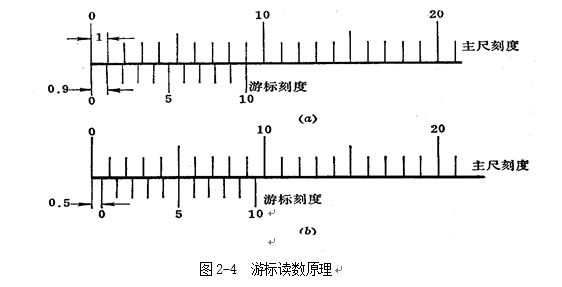 當(dāng)游標(biāo)向右移動(dòng)0.1mm時(shí),則游標(biāo)零線后的第1根刻線與主尺刻線對(duì)準(zhǔn)。當(dāng)游標(biāo)向右移動(dòng)0.2mm時(shí),則游標(biāo)零線后的第2根刻線與主尺刻線對(duì)準(zhǔn),依次類推。若游標(biāo)向右移動(dòng)0.5mm,如圖2-4(b),則游標(biāo)上的第5根刻線與主尺刻線對(duì)準(zhǔn)。由此可知,游標(biāo)向右移動(dòng)不足1mm的距離,雖不能直接從主尺讀出,但可以由游標(biāo)的某一根刻線與主尺刻線對(duì)準(zhǔn)時(shí),該游標(biāo)刻線的次序數(shù)乘其讀數(shù)值而讀出其小數(shù)值。例如,圖2―4(b)的尺寸即為:5×0.1=0.5(mm)。
