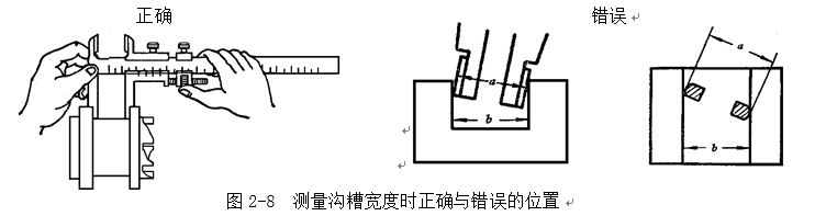 測(cè)量溝槽寬度時(shí),也要放正游標(biāo)卡尺的位置,應(yīng)使卡尺兩測(cè)量刃的聯(lián)線垂直于溝槽,不能歪斜.否則,量爪若在如圖2-8所示的錯(cuò)誤的位置上,也將使測(cè)量結(jié)果不準(zhǔn)確(可能大也可能?。?。
