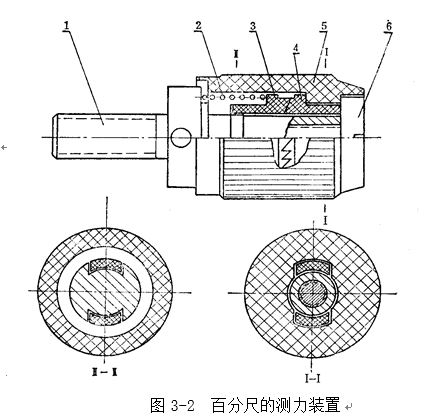 百分尺測力裝置的結構見圖3-2,主要依靠一對棘輪3和4的作用。棘輪4與轉帽5連結成一體,而棘輪3可壓縮彈簧2在輪軸1的軸線方向移動,但不能轉動。彈簧2的彈力是控制測量壓力的,螺釘6使彈簧壓縮到百分尺所規(guī)定的測量壓力。當我們手握轉帽5順時針旋轉測力裝置時,若測量壓力小于彈簧2的彈力,轉帽的運動就通過棘輪傳給輪軸1(帶動測微螺桿旋轉),使百分尺兩測量面之間的距離繼續(xù)縮短,即繼續(xù)卡緊零件;當測量壓力達到或略微超過彈簧的彈力時,棘輪3與4在其嚙合斜面的作用下,壓縮彈簧2,使棘輪4沿著棘輪3的嚙合斜面滑動,轉帽的轉動就不能帶動測微螺桿旋轉,同時發(fā)出嘎嘎的棘輪跳動聲,表示巳達到了額定測量壓力,從而達到控制測量壓力的目的。當轉帽逆時針旋轉時,棘輪4是用垂直面帶動棘輪3,不會產(chǎn)生壓縮彈簧的壓力,始終能帶動測微螺桿退出被測零件。