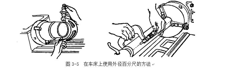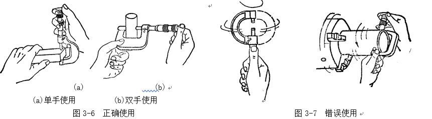 值得提出的是幾種使用外徑百分尺的錯誤方法,比如用百分尺測量旋轉(zhuǎn)運動中的工件,很容易使百分尺磨損,而且測量也不準(zhǔn)確;又如貪圖快一點得出讀數(shù),握著微分筒來揮轉(zhuǎn)(圖3-7) 等,這同碰撞那樣,也會破壞百分尺的內(nèi)部結(jié)構(gòu)。